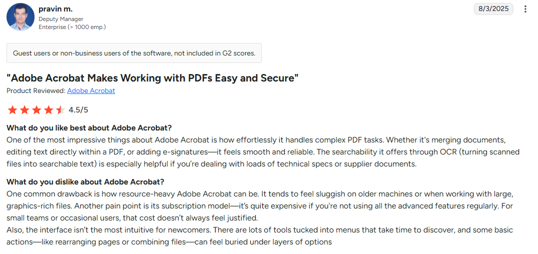 Multiple users appreciate Adobe's trusted brand and comprehensive feature set, though some find the pricing higher than alternatives and the interface can be complex for basic users.